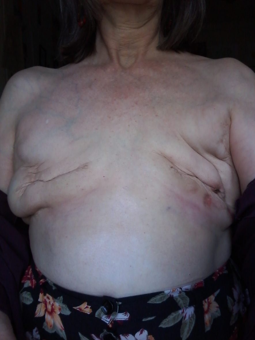 I went in for a double mastectomy on August 14th. Several of my closest friends had walked this path before me and I had no idea there were hidden pitfalls ahead. They both wanted flat and got flat. I told my surgeon that I wanted a flat chest. He looked at his shoes and muttered that a lot of women had been requesting that lately. He said he was concerned that I would look in the mirror and be depressed by what I saw if I was flat. I told him I’d seen my friend’s chest and that I’d be fine with being like that. I foolishly thought [Ed. Stephanie was not wrong to trust her surgeon… her surgeon was wrong to so egregiously violate her trust, and the blame is squarely on his shoulders] that that would be the end of it. The last thing I said to him on my way to surgery was, “I trust you”. Other folks had told me he was an excellent surgeon.