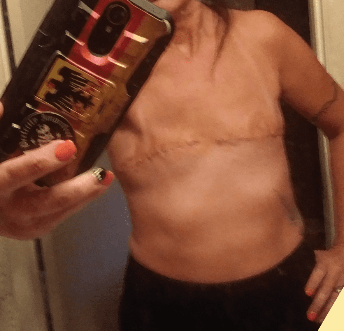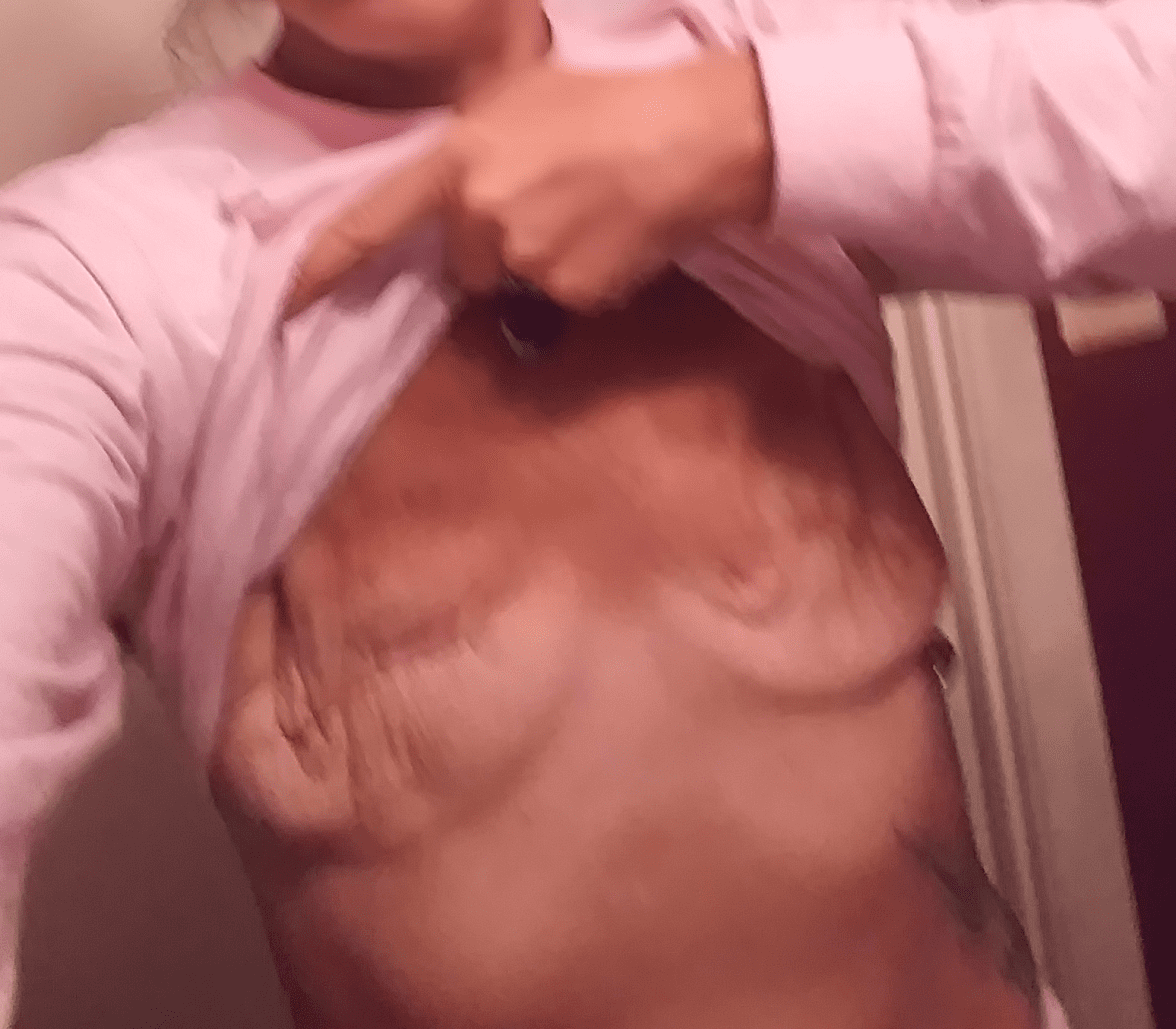 In September 2017, I had a double mastectomy and everything happened so fast. I was coerced into reconstruction and just went with it. My primary concern was having my cancer surgically removed. I had had a lumpectomy in the same breast 5 years previous and being small-breasted, I thought there was no salvaging the breast and opted for mastectomy. I then decided on a double for two reasons: I wanted symmetry, and I didn’t want to find cancer at some later time if I kept the healthy breast [Ed. the risk of new primary breast cancer in the remaining breast is at least doubled once a woman has had her first breast cancer diagnosis, relative to the general population.]